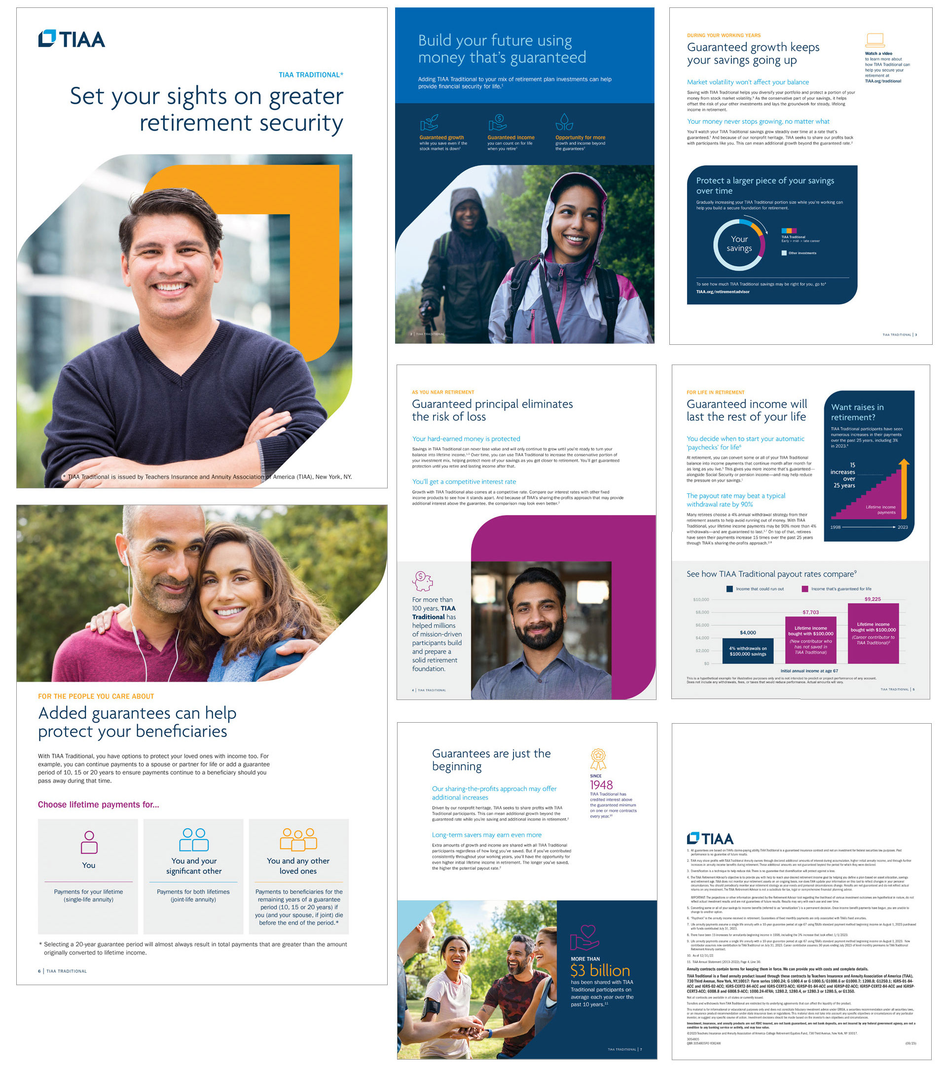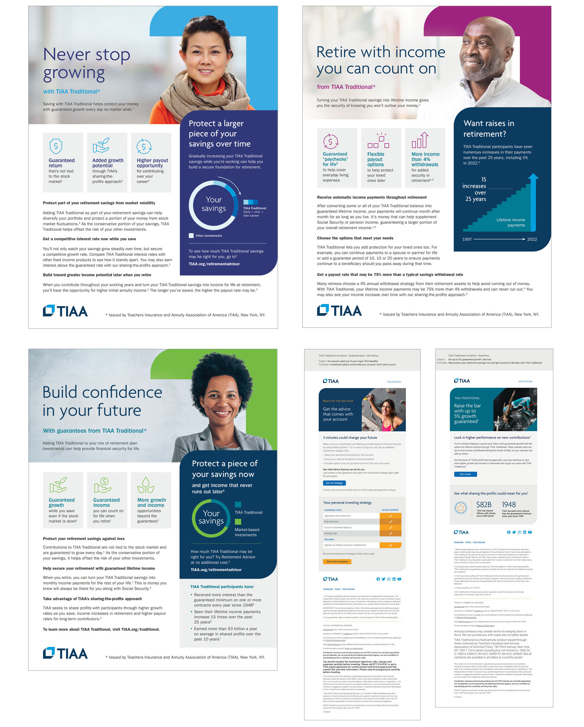 TIAA required clear, consistent brand expression across a range of marketing and informational materials within a highly regulated financial services environment. The work focused on applying and supporting the brand identity system while ensuring accuracy, clarity, and trust across all deliverables.