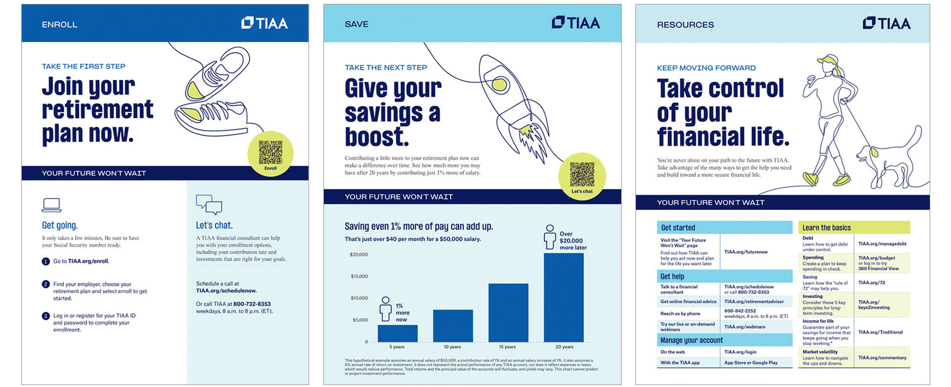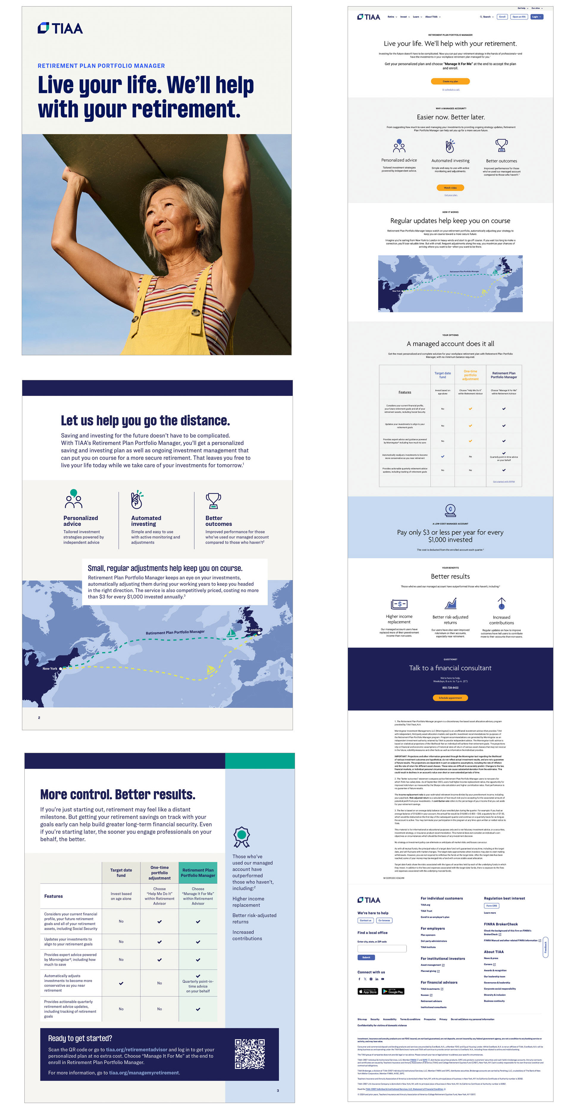 During this engagement, TIAA’s brand identity was evolving. I worked within available brand guidelines while closely referencing other brand touchpoints — including website design and customer-facing materials — to ensure designs reflected the most current visual standards. Collaborating with internal teams, I provided hands-on design support across print and digital materials, maintaining brand cohesion throughout this period of transition.